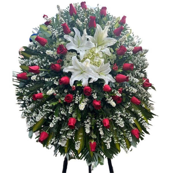 Corona fúnebre roja, con hortensias blancas, rosas rojas, hojas de dracenia, monte casino, hojas de palmera y hojas de eucalipto.