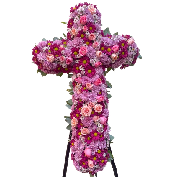Hermosa cruz fúnebre vintage con rosas rosadas, finas margaritas rosadas, mini pompos y follaje elegante.
