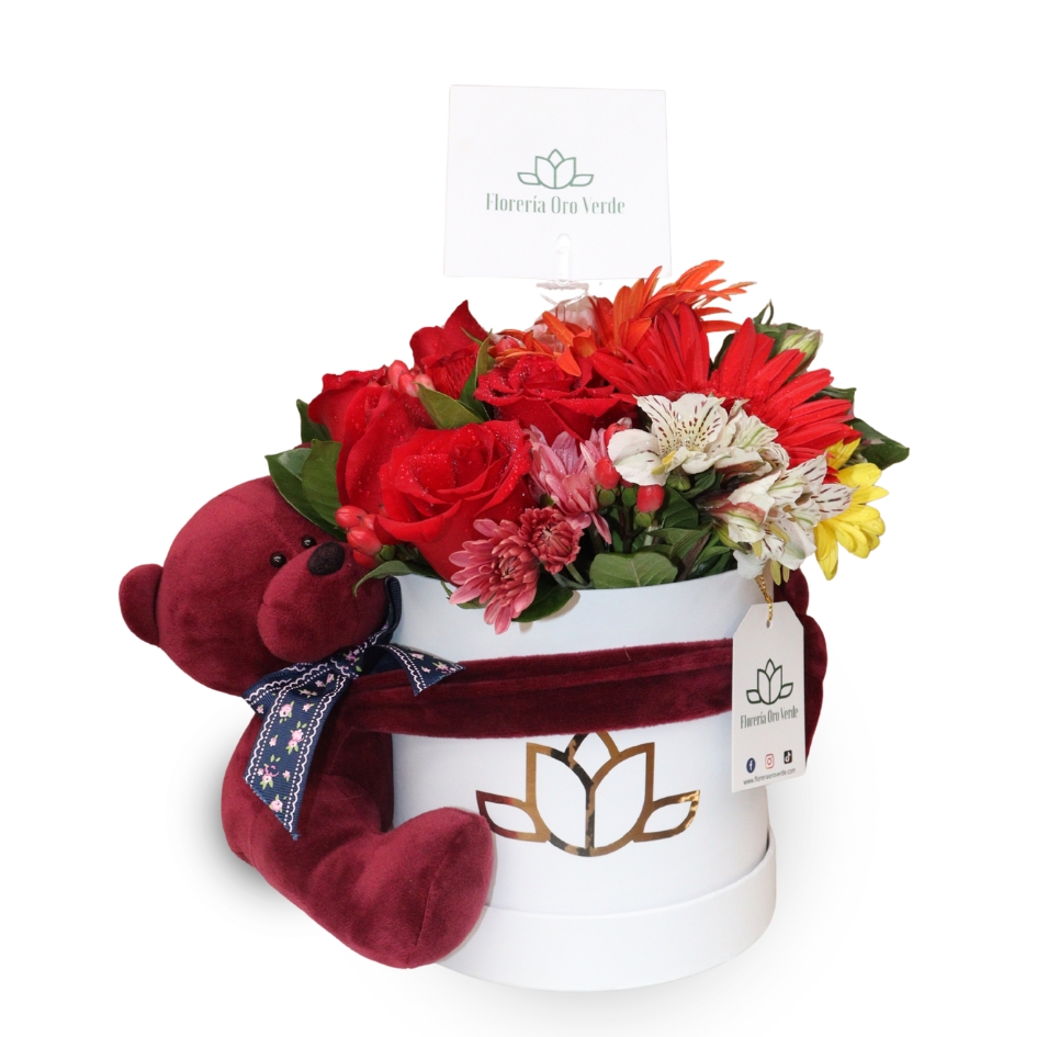 Hermoso box con rosas rojas, acompañado de bello peluche.